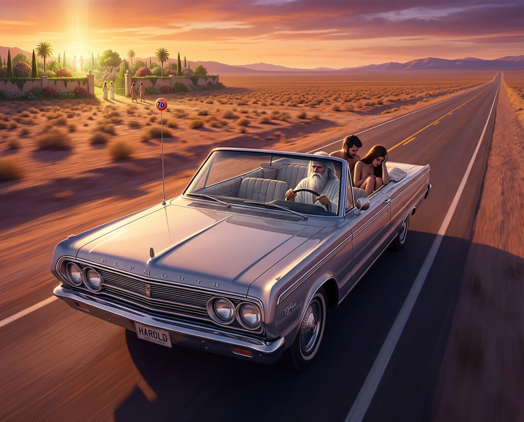 January 30, 2024March 12, 2026 Bible, Illustrated (A Graphic Novel) Reading Time: 2 minutes To capture the growing illiterate and low attention span market, I am currently undertaking the creation of an illustrated Bible, beginning with the book of Genesis. We need to figure out some things for our images. What did God drive? Do we know his name? It’s all in there. It’s clear that Harold drove a Plymouth. “And he drove them out of Eden in his Fury.” “Our Father who art in heaven, Harold be thy name.” He dumped them somewhere east of the Edens (I’m presuming the expressway), so that might be Skokie, Il. R. Crumb has beat me to the entire book of Genesis. This was more relatable in the days before GPS. Few people are aware, but Jesus had a spectacular ass, which I guess you’d expect if you think about it. It’s unclear what he called this donkey. I think it was probably named gluteus maximus. Art